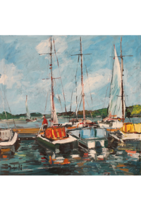Bánfi József: Kikötő piros-sárga csíkos vitorlásokkal (Balaton)