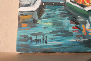 / Bánfi József: Kikötő piros-sárga csíkos vitorlásokkal (Balaton)
